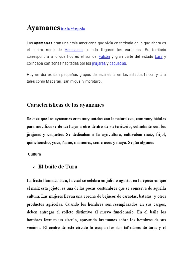 Aunado a esto cabe destacar que los Ayamanes y Jirajaras comparten una tradicin que es realizada dos veces al ao especficamente en el mes de mayo y en el mes de septiembre la cual es llamada La Danza de las Turas o Estercueye esta es realiza para pedir que en ese ao obtengas una buena cosecha de sus cultivos y agradecer los beneficios obtenidos en el transcurso del ao en otras palabras este. Su territorio correspondía a lo que hoy es el sur de Falcón y gran parte del estado Lara y colindaba con zonas habitadas por los jirajaras y. Lesplorador alemán Nicolás Federmann de la casa Welser dAugsburgu sale de Coro el 12 de setiembre de 1530 nuna espedición escontral Sur y pasa por territorios de los jirajaras ayamanes y guayones.